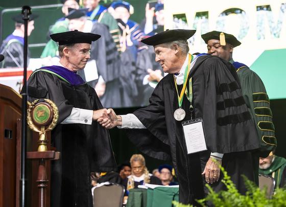 Spring Commencement also provided an opportunity for the university to honor some of its most enduring champions. Stimson awarded the George Mason Medal, the university’s highest honorary award, to Robert E. Buchanan, a leading real estate developer who has served the university and Washington, D.C., civic causes for decades while also working with other business leaders to shape the region’s economic direction.