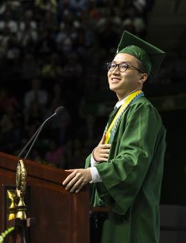 Student speaker Duy Ha Vu, a double major in public administration and business who moved to the United States from Vietnam, recalled personal triumphs, such as working at the Schar School of Policy and Government, founding a billiards club, and spending a semester at Mason Korea.